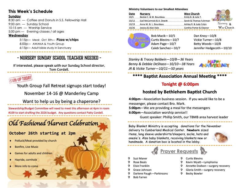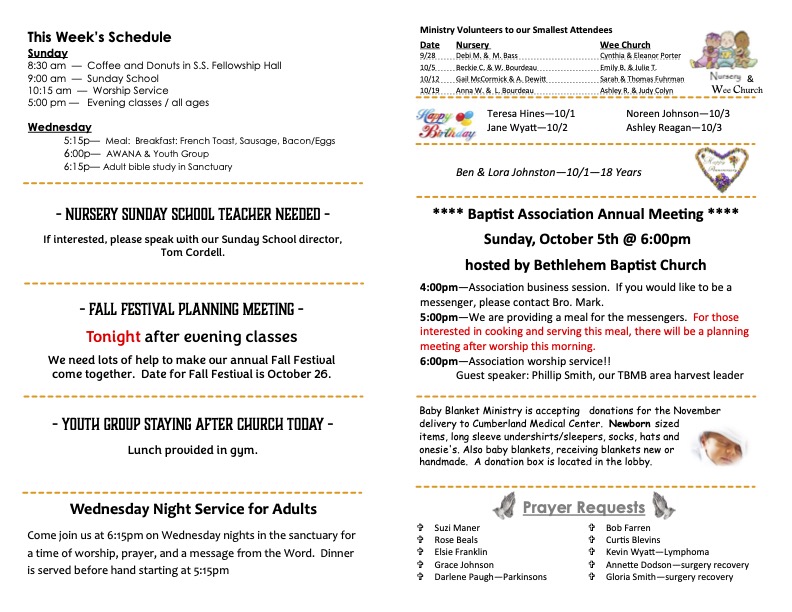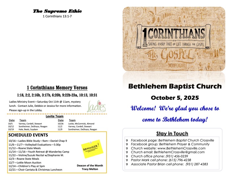 Bethlehem Baptist Church has been in existence since 1872. Throughout its existence, the members of Bethlehem have endeavored to reach the plateau region of Crossville, Tennessee with the gospel of Jesus Christ. This remains our mission. Along with weekly services we offer various classes, events, and community outreach ministries to the citizens of Crossville, Cumberland County and surrounding counties. If you are seeking a church home, would like to become part of one of the outreach ministries or just wanting to know more about Jesus, come join us! We would love to share the ministry with you and get to know you personally.