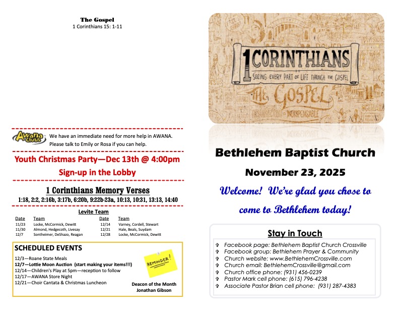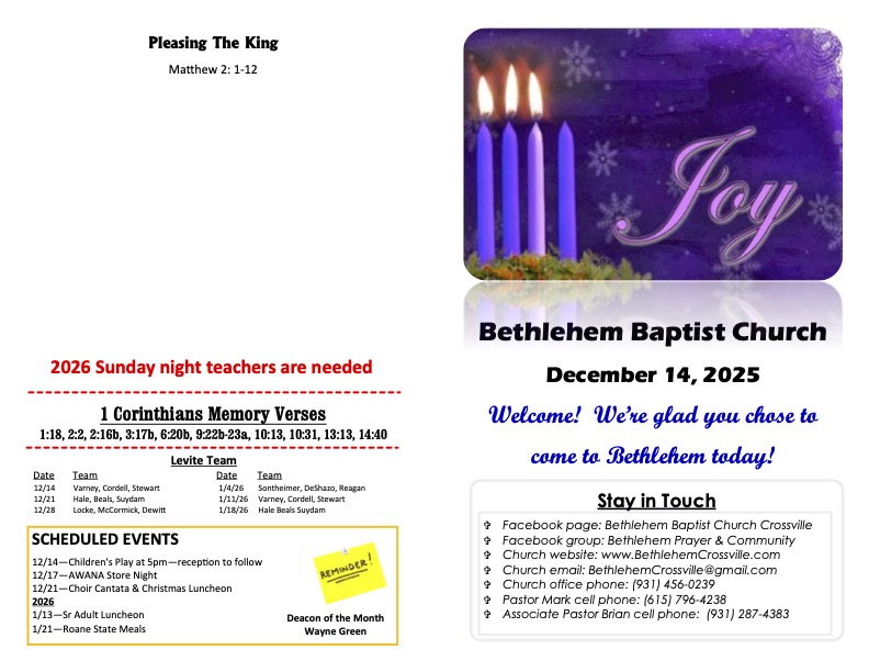 Bethlehem Baptist Church has been in existence since 1872. Throughout its existence, the members of Bethlehem have endeavored to reach the plateau region of Crossville, Tennessee with the gospel of Jesus Christ. This remains our mission. Along with weekly services we offer various classes, events, and community outreach ministries to the citizens of Crossville, Cumberland County and surrounding counties. If you are seeking a church home, would like to become part of one of the outreach ministries or just wanting to know more about Jesus, come join us! We would love to share the ministry with you and get to know you personally.