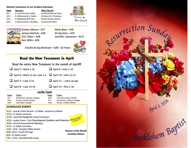 To visit our livestream on Sunday Morinings, open Youtube on your phone, computer or streaming TV and enter “Bethlehem Baptist @Bethlehemcrossville”. Remember to click the “subscribe” button to save it in your favorites and enjoy Worship service form your location. Currently, only Sunday morning Worship is live stream. Missed a service? Return to our Youtube channel and view any of the archived services listed.